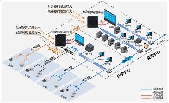 M60視頻綜合平臺,通過對模擬、IP、SDI等多種技術(shù)的接入,實(shí)現(xiàn)對平安城市系統(tǒng)中社會(huì)監(jiān)控資源、公安IP/SDI高清監(jiān)控資源、公安早期模擬監(jiān)控資源等多種監(jiān)控資源的整合。