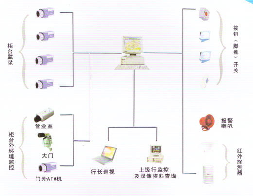 可選配移動(dòng)檢測(cè)報(bào)警、探測(cè)器報(bào)警、網(wǎng)絡(luò)監(jiān)控和云臺(tái)鏡頭控制等功能,將銀行保安監(jiān)控、中心監(jiān)控、分控和柜員制監(jiān)控合而為一,組成完整的大型網(wǎng)絡(luò)化綜合性監(jiān)控系統(tǒng)。