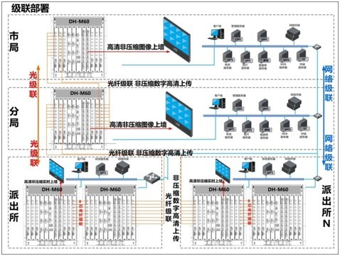 M60視頻綜合平臺支持派出所-分局-市局-省廳多個(gè)層級之間的級聯(lián)部署,通過光傳輸技術(shù)打破原有視頻窄帶傳輸?shù)钠款i,實(shí)現(xiàn)了高清非壓縮圖像數(shù)據(jù)多層級之間的無延時(shí)傳遞。滿足平安城市系統(tǒng)中各級用戶主體對圖像高質(zhì)量及控制低延時(shí)的要求。