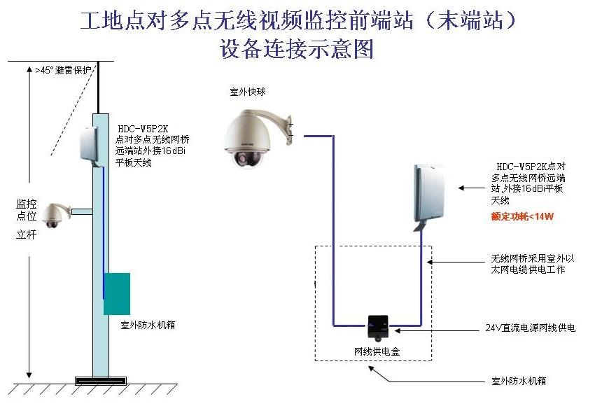為保證某項目工程安全順利進行,公司管理人員能夠及時了解施工現(xiàn)場情況和施工進度,在工程現(xiàn)場安裝了合肥環(huán)宇智能工程有限公司的5.8GHz室外點對點、點對多點無線視頻監(jiān)控系統(tǒng),該系統(tǒng)由合肥監(jiān)控公司環(huán)宇智能的點對點、點對多點無線網(wǎng)橋和200W網(wǎng)絡(luò)高速球組成。