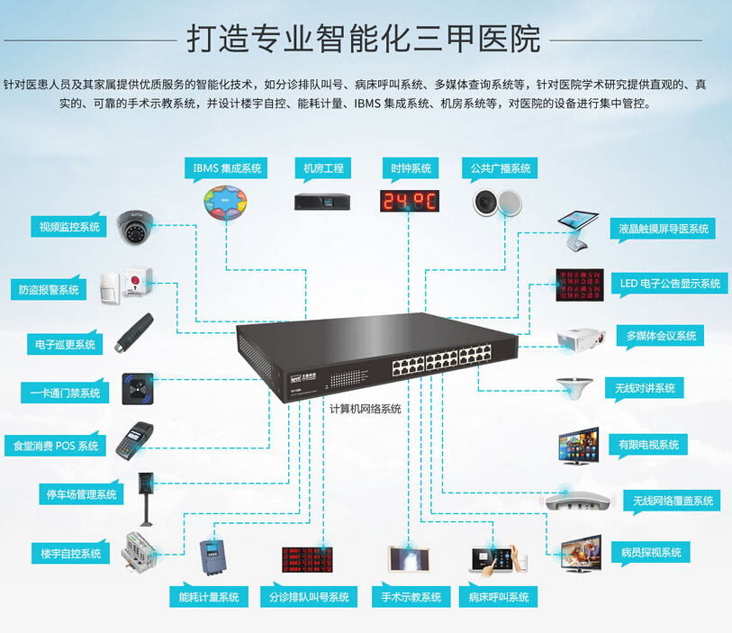 本套餐針對醫(yī)院內(nèi)的設備密集,管理復雜,物流量大的特點,設置樓宇自控、能耗計量、IBMS集成系統(tǒng)、機房等系統(tǒng),利用傳感器、能源計量表、IBMS集成的全管理平臺等方式,對醫(yī)院的設備進行一個集中的管控。